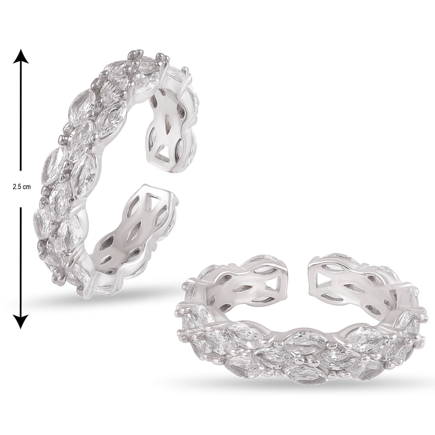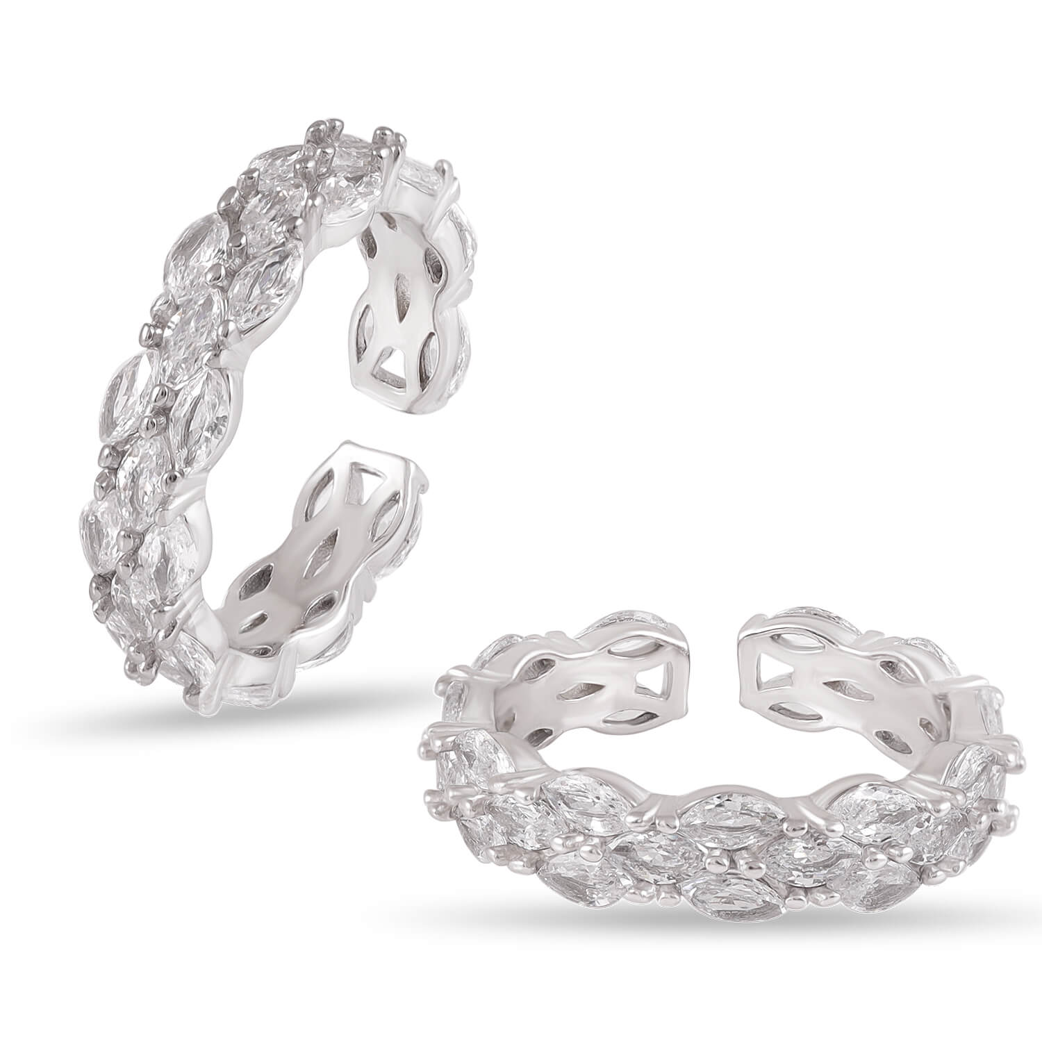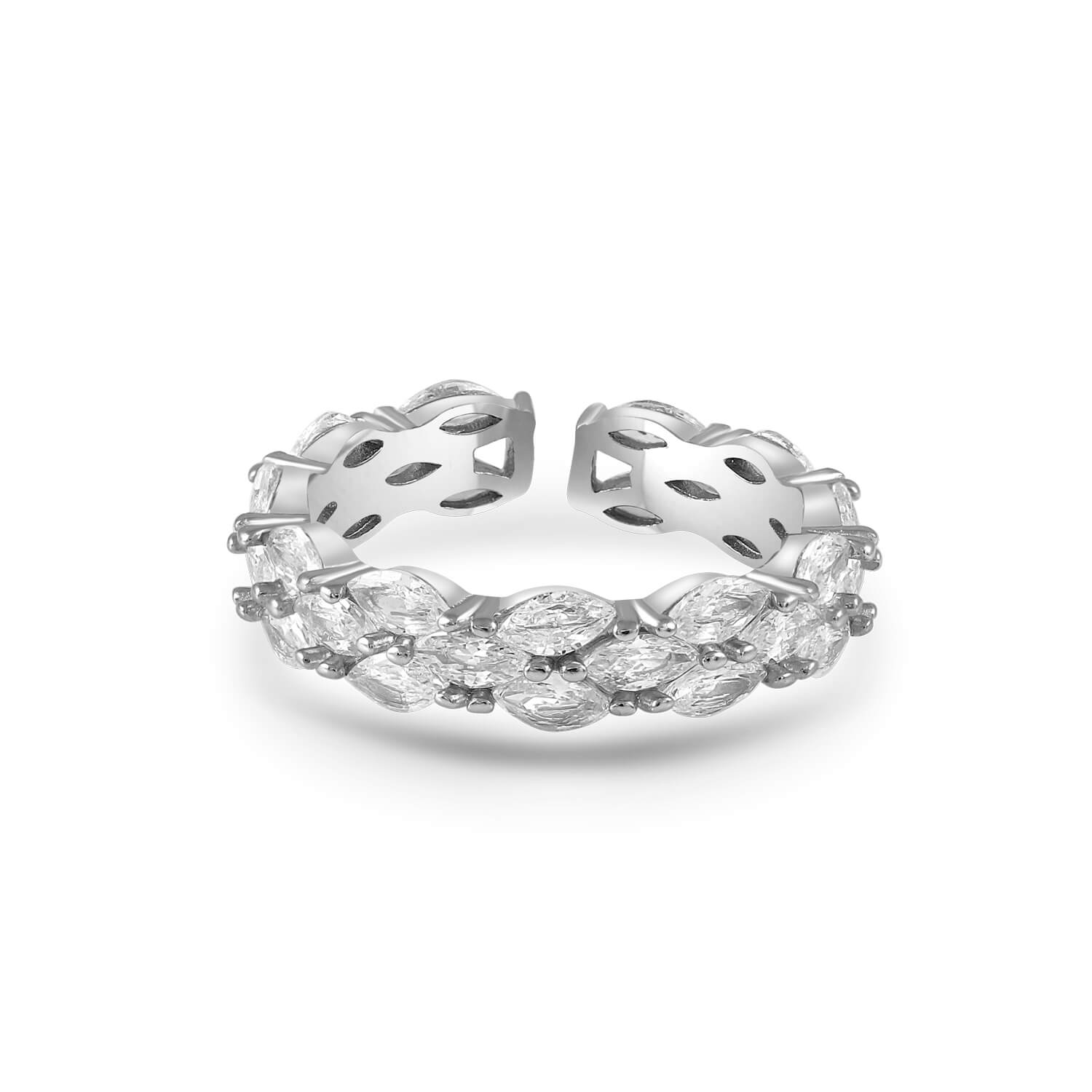 Meet Alva — a stunning 92.5 sterling silver band, set with marquise-cut crystals that shimmer like dewdrops in the morning sun. Its open design makes it comfortable, elegant, and perfect for stacking.