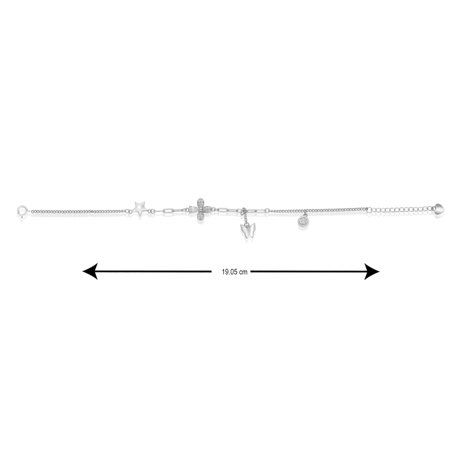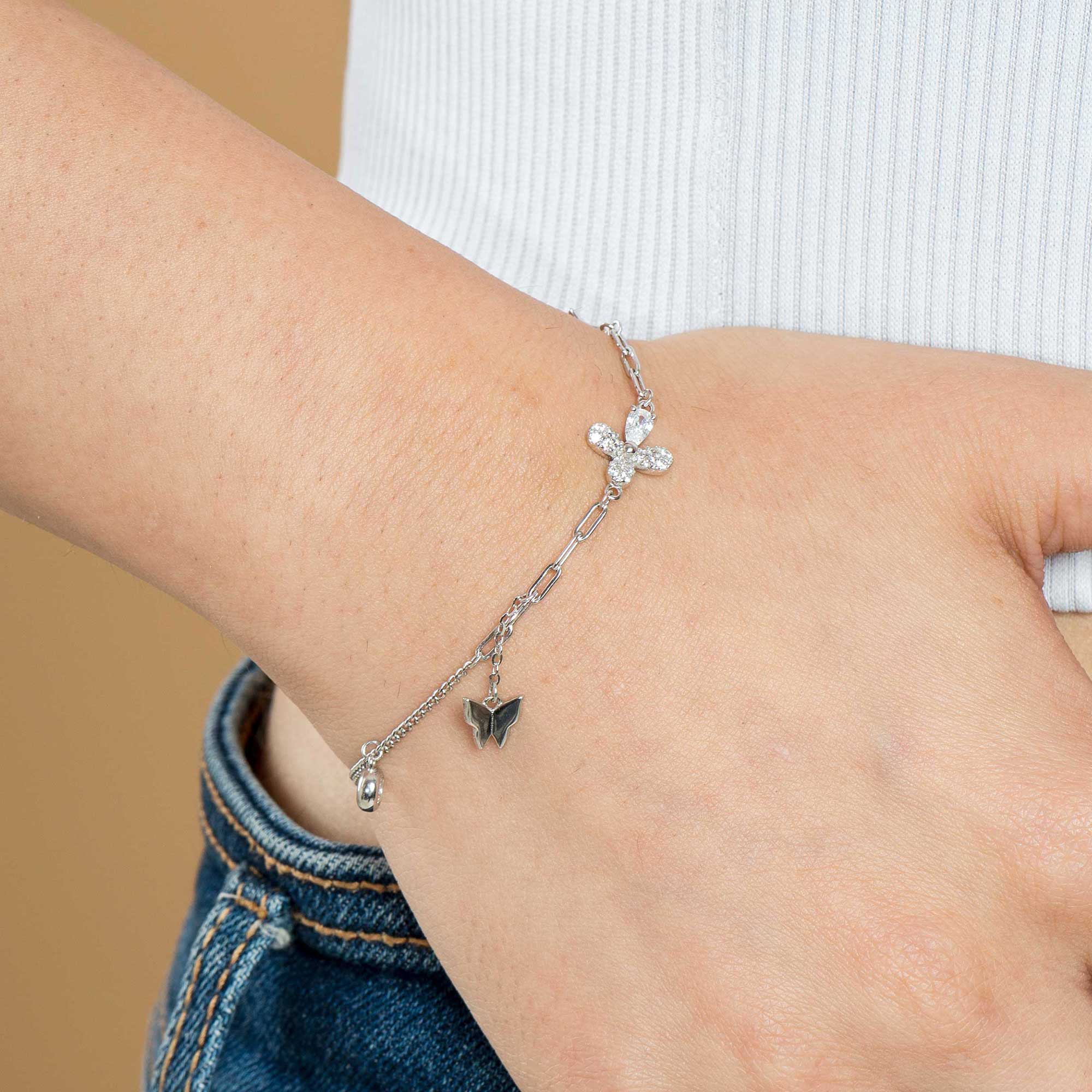 The Astrea Star Butterfly Flower Pearl Bracelet is an enchanting, eclectic piece crafted from radiant 925 sterling silver. This bracelet is a celebration of delicate motifs, featuring small charms including a whimsical star, a dainty butterfly, and a subtle flower, all accented by luminous pearls. It offers a layered, charming aesthetic perfect for a light and feminine style.