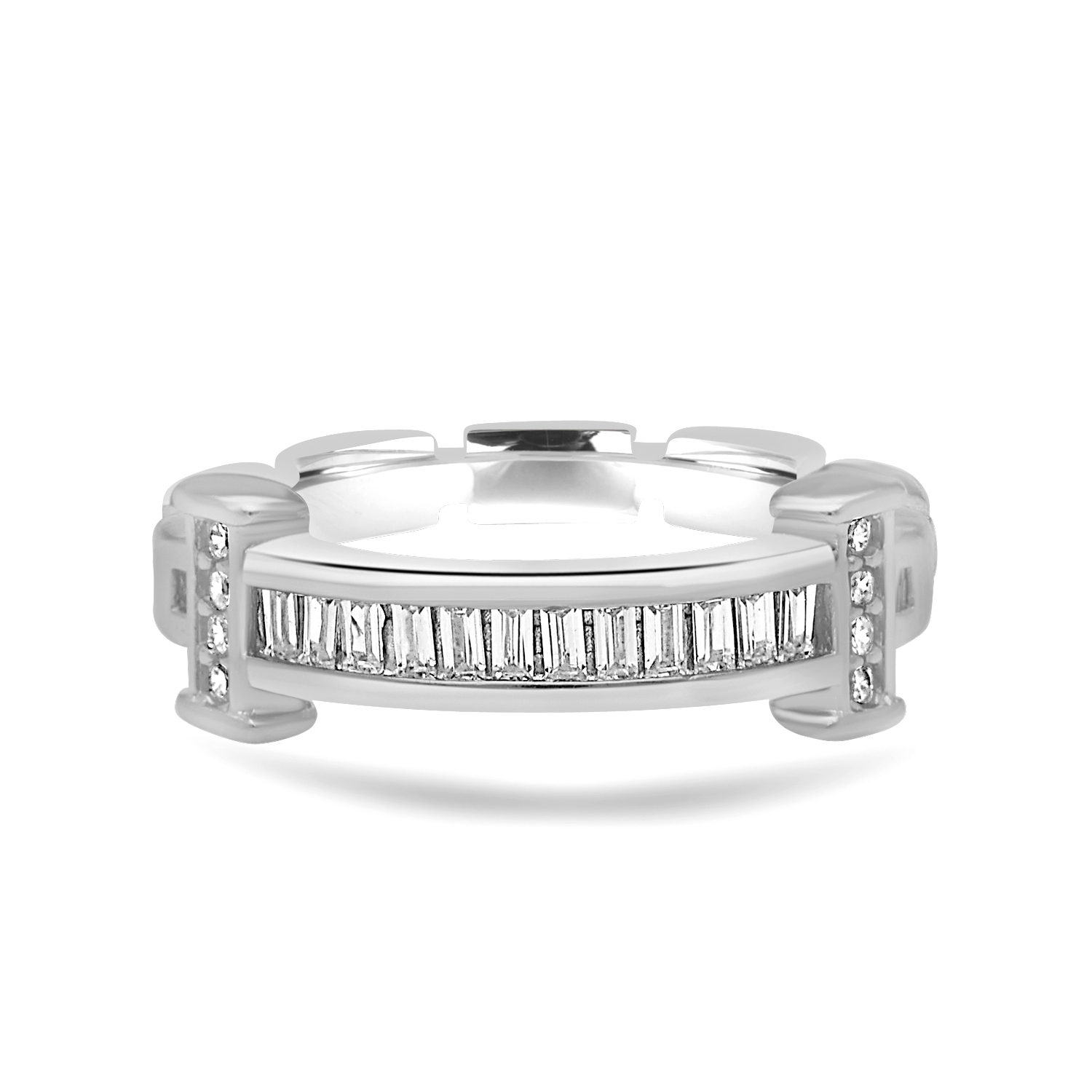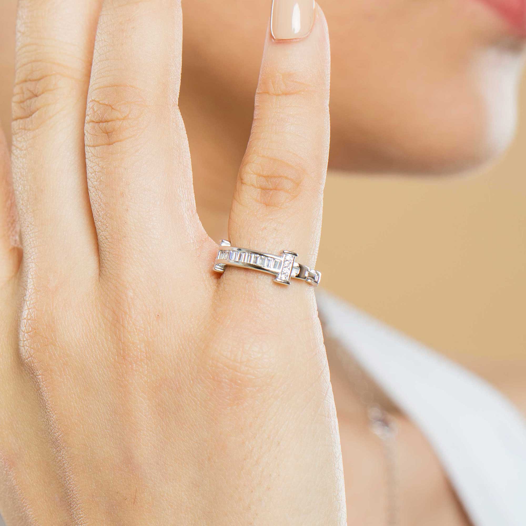 The Brivelle Silver Bridge Ring is a uniquely structured statement piece defined by its architectural center. The silver setting features a distinctive “bridge” design, where the band splits and rises to securely elevate the central element. This elevated structure often highlights a row of sparkling stones or a larger solitaire gem nestled securely underneath, giving the ring a substantial, sophisticated, and modern profile.