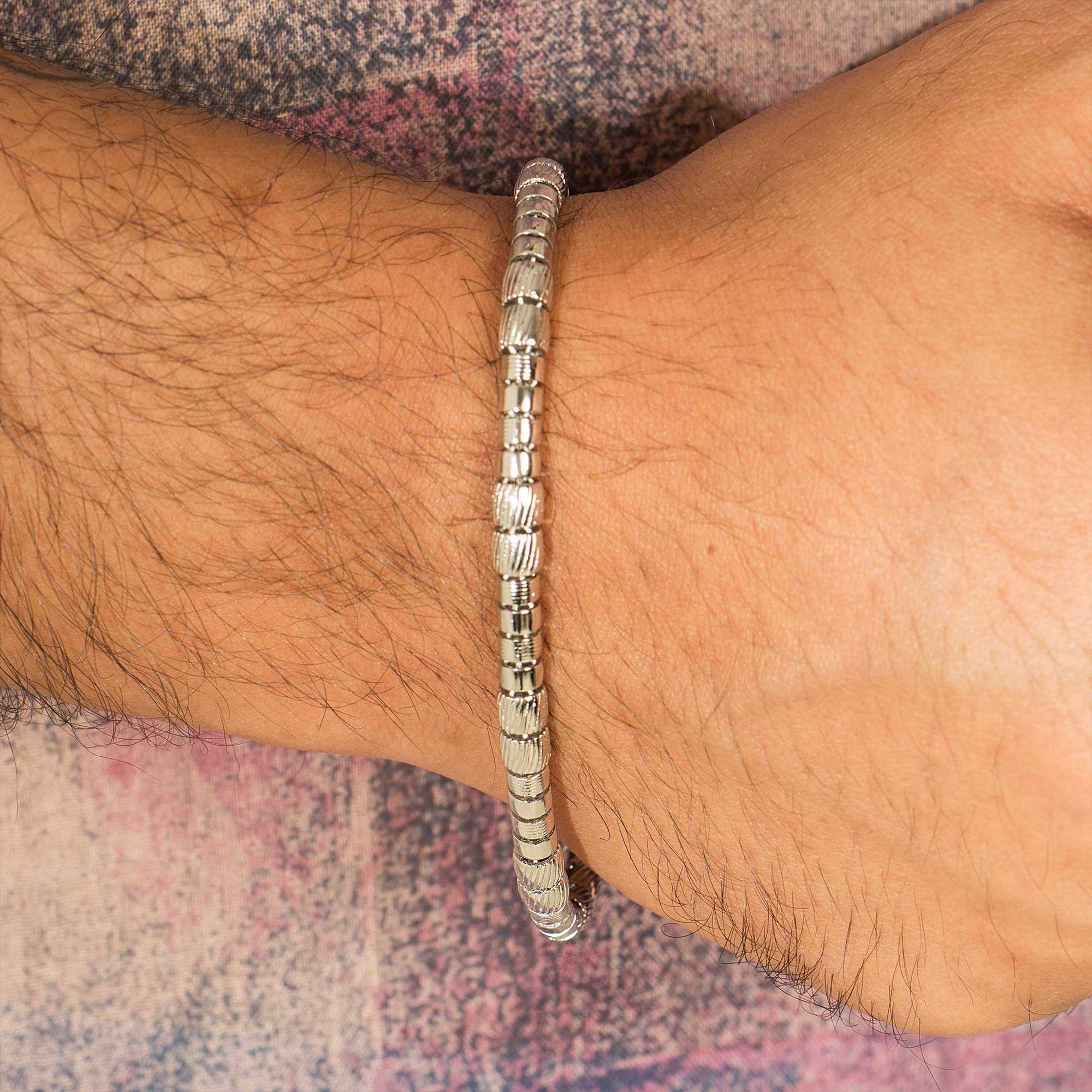 The Cylor Cylinder Chain Link Bracelet is a contemporary and substantial piece for men, crafted from durable 925 sterling silver. It features a unique link design composed of smooth, polished cylinder shapes connected by thick chain links. This bold bracelet offers a modern, heavy-duty look that makes a distinct style statement.