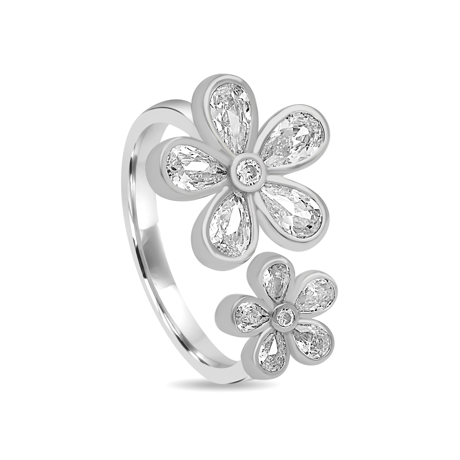 This Duelle Double Flower Ring features a charming, romantic design with two connected floral motifs. A larger flower is paired with a smaller flower, creating an eye-catching, layered look. The design is likely meant to be an adjustable or open ring, with the flowers serving as the elegant terminals on the band.