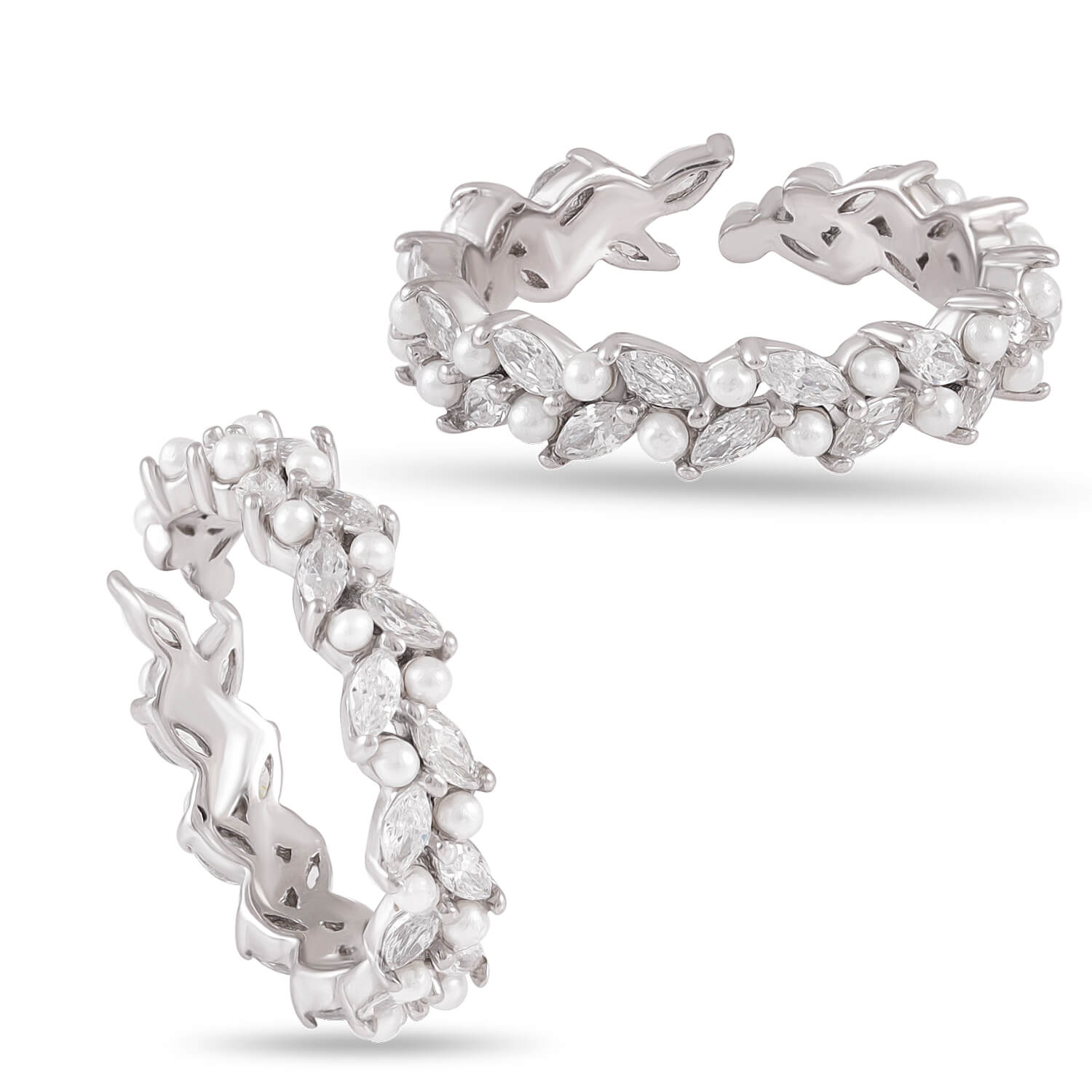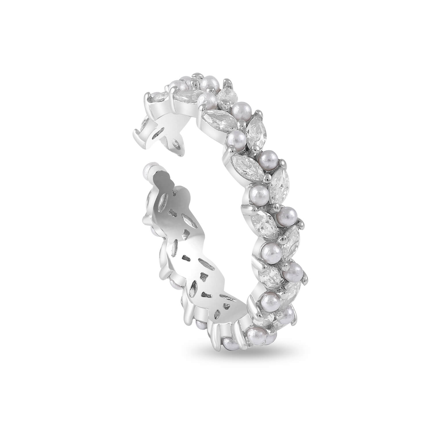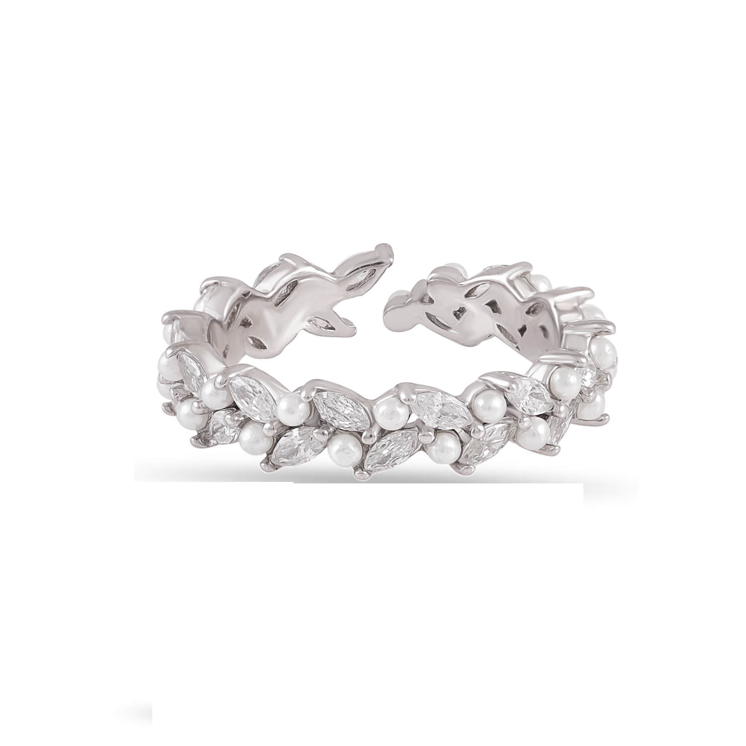 This elegant band captures the essence of soft luxury — luminous pearls paired with sparkling crystals form a wreath-like design that wraps gracefully around your finger. A symbol of eternal beauty.