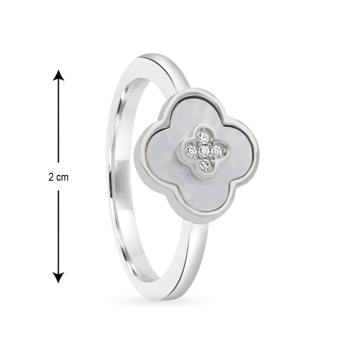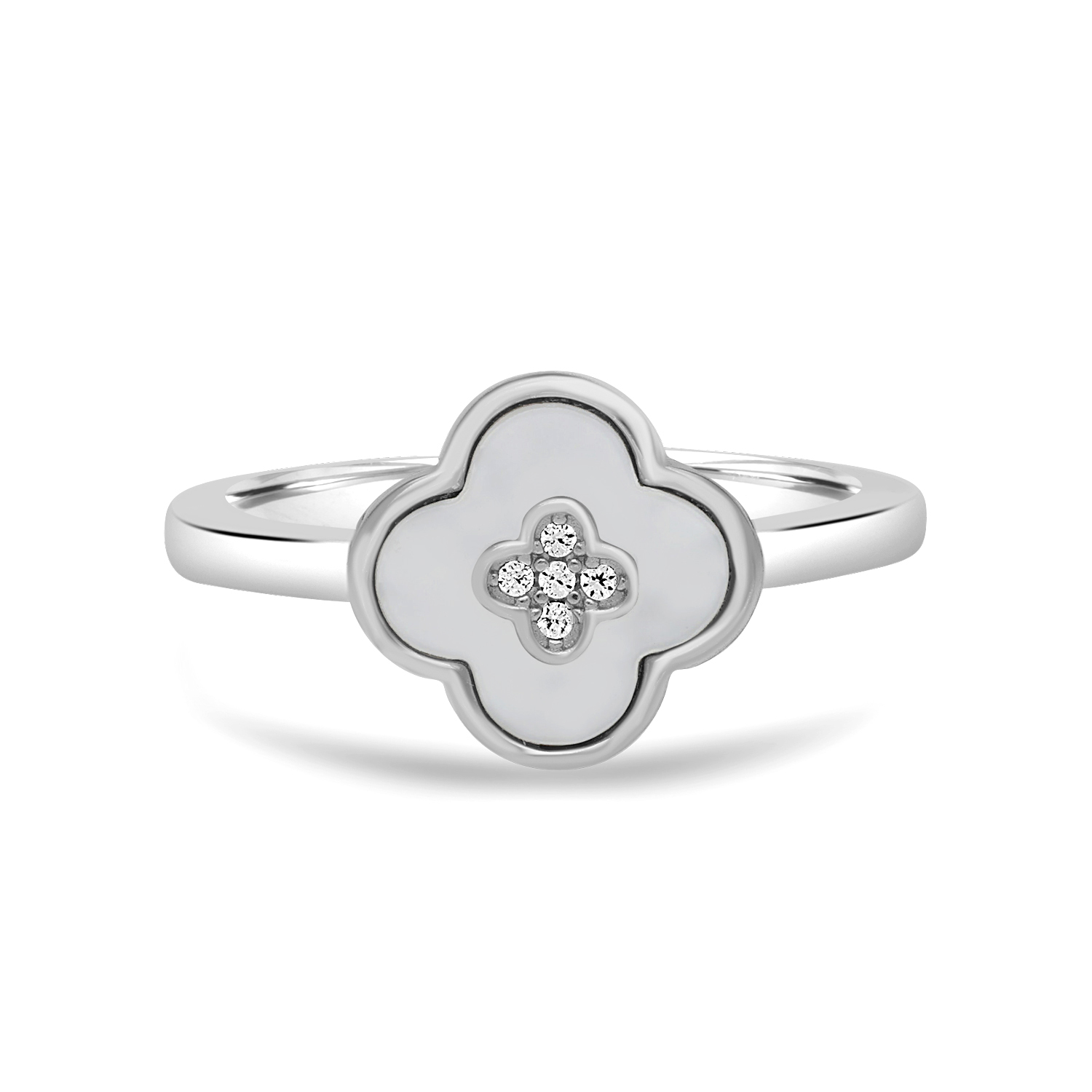 The Quadraflor Ring is a dainty and sophisticated piece featuring the beloved four-leaf clover motif, symbolizing luck and elegance. It is crafted in polished silver with the petals meticulously inlaid with iridescent Mother of Pearl (MOP). The center of the clover is adorned with a sparkling cluster of tiny cubic zirconia (CZ) stones, all set on a simple, adjustable band.