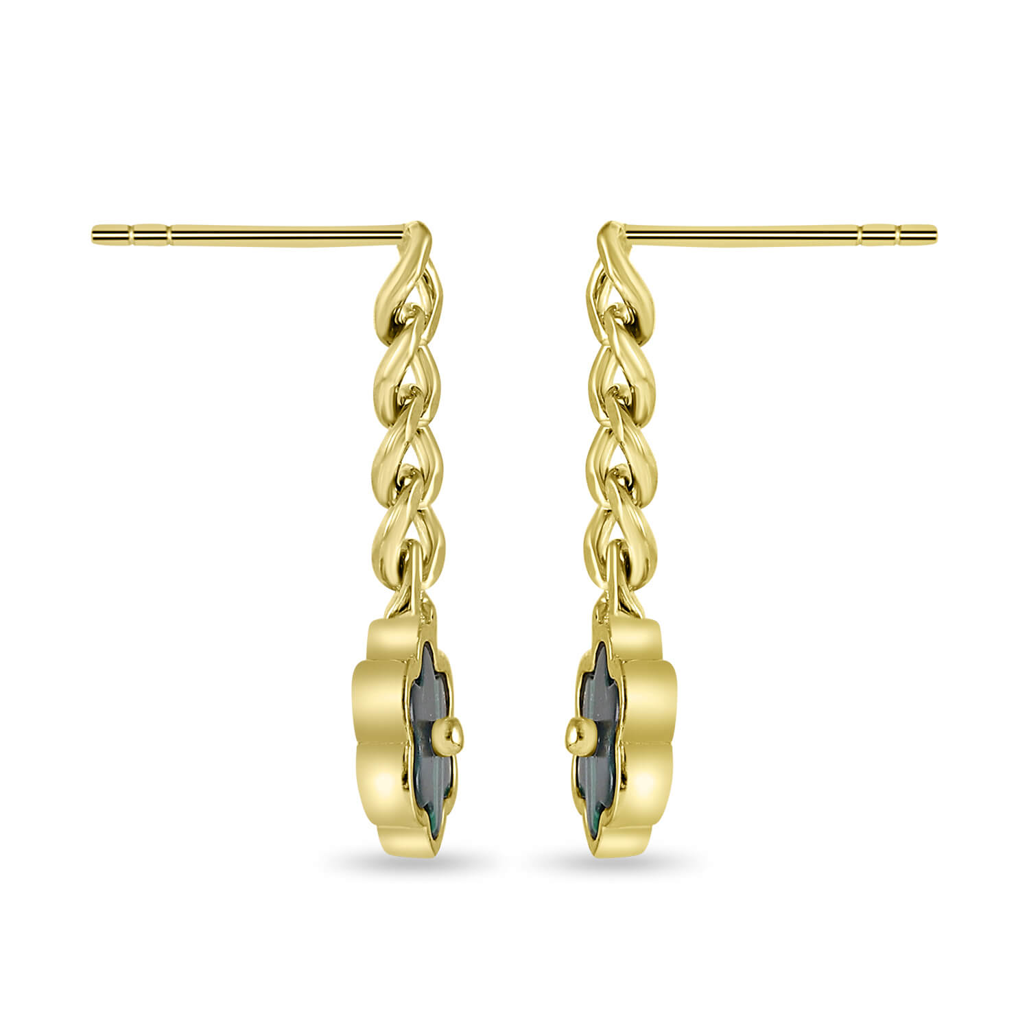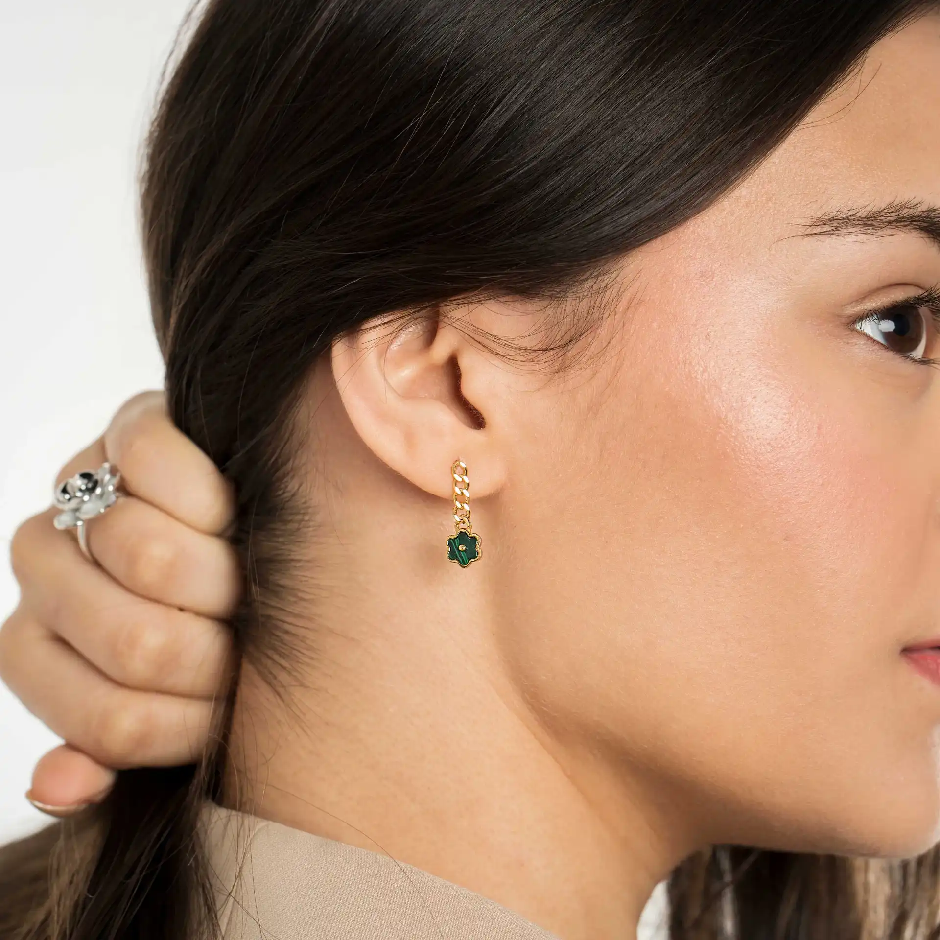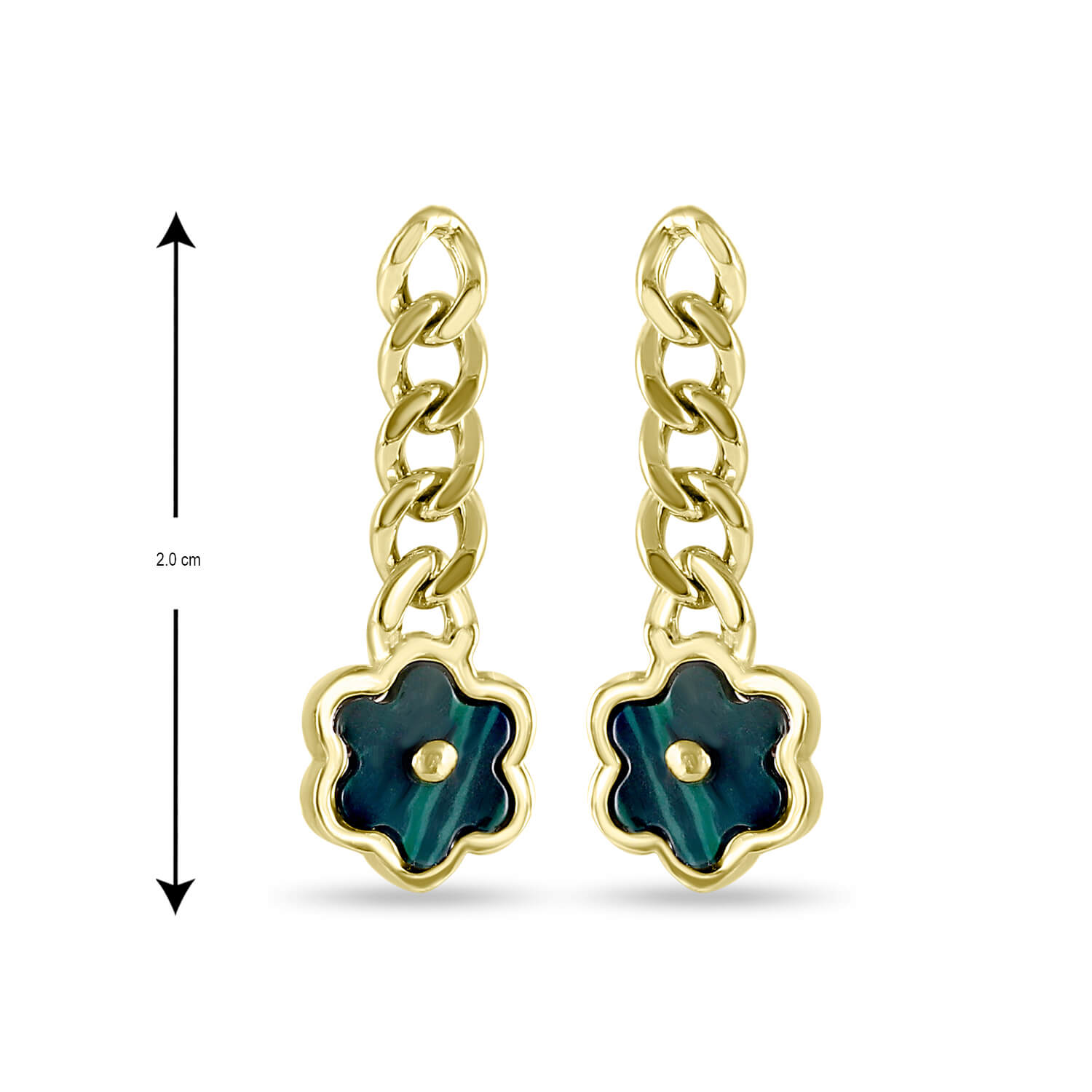 The charming Thalis drop earrings feature a playful yet elegant design, crafted with a delicate chain link made of pure 925 sterling silver. A vibrant green, flower-shaped charm is suspended below, adding a lovely pop of color and a whimsical touch. These dainty earrings are perfect for adding a subtle flourish and a hint of nature-inspired beauty to your everyday look.