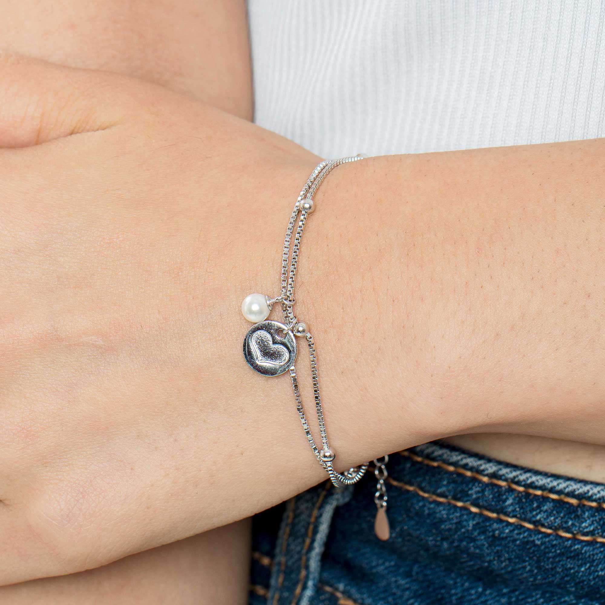 The Lovira Heart Circle Bracelet is a delicate and feminine piece crafted from luminous 925 sterling silver. It features a central silver circle charm detailed with a subtle heart print engraving. This focal point is gracefully flanked by one or more elegant, smooth pearls, offering a harmonious blend of romantic motif and classic charm.