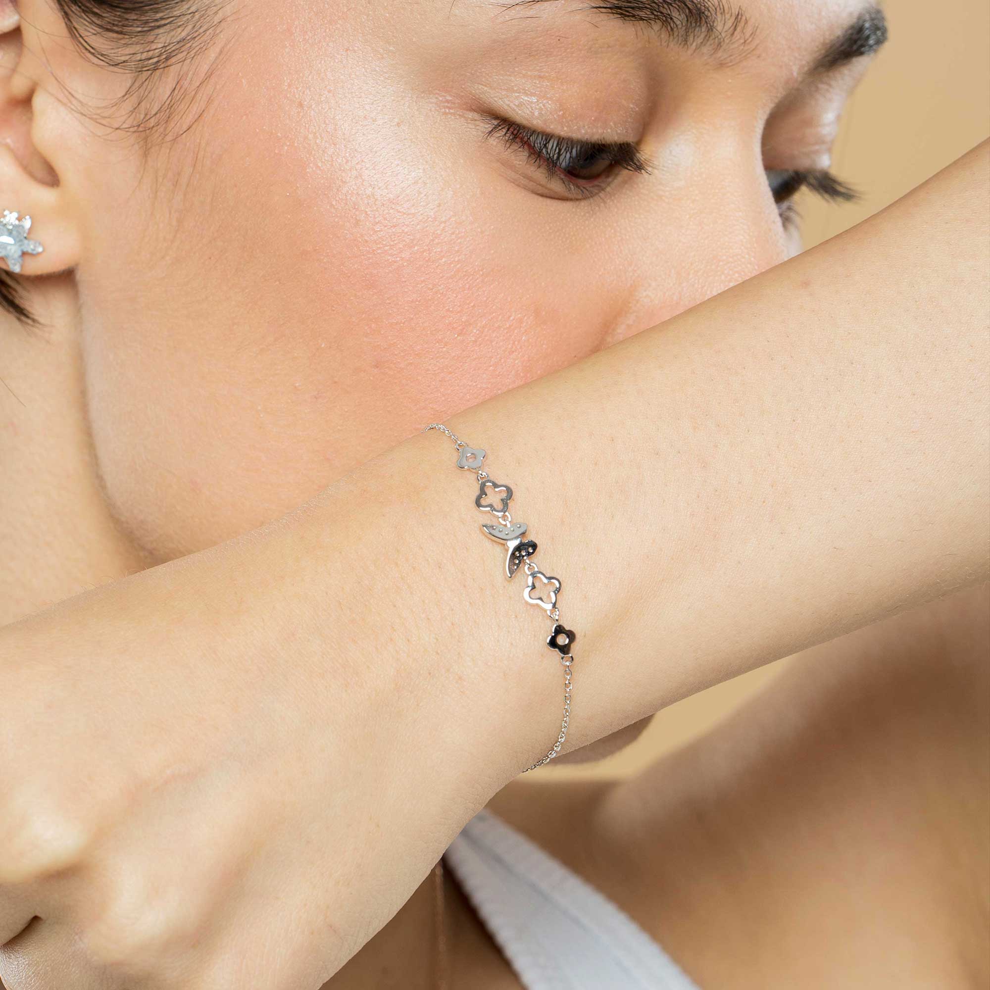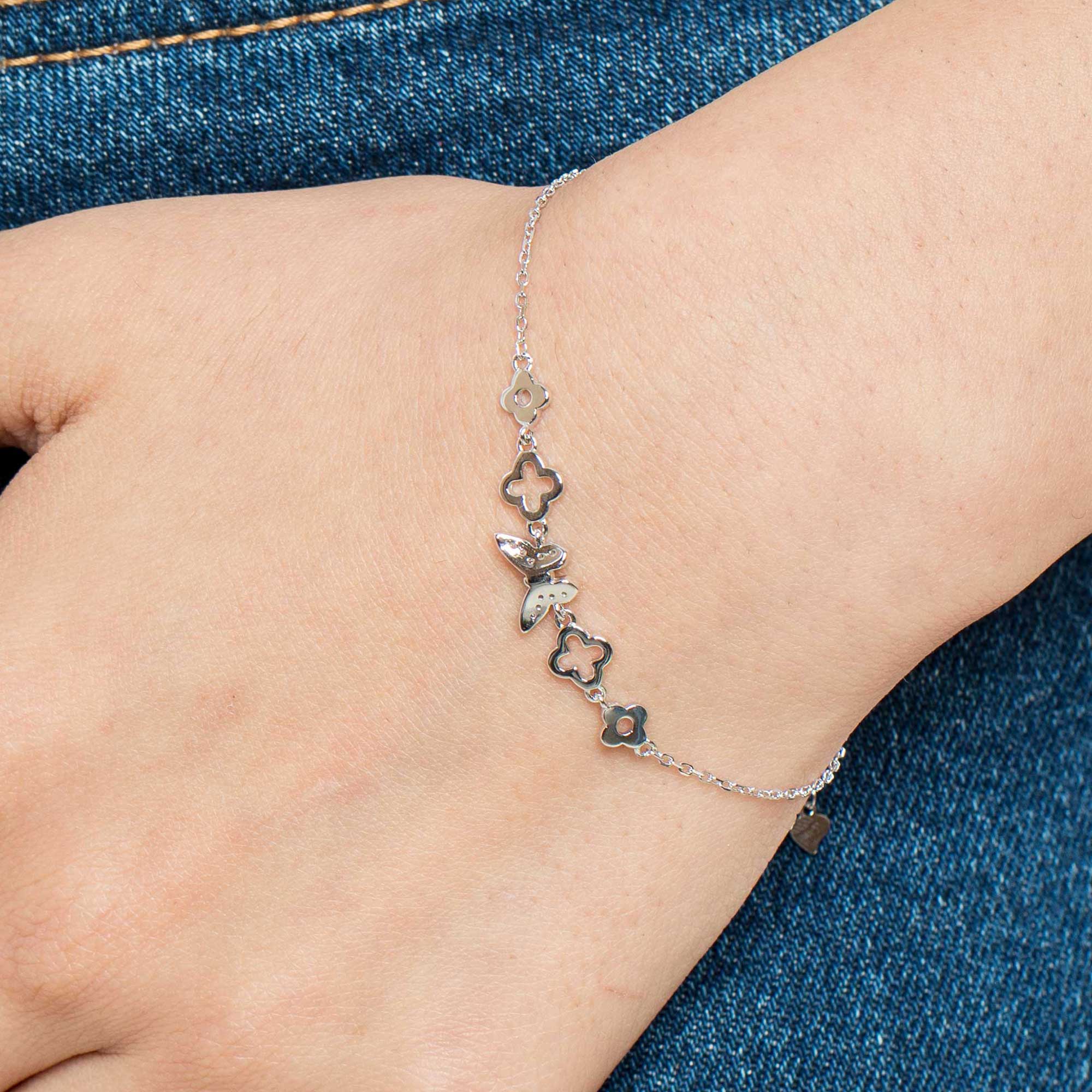 The Papivelle Butterfly Vancleaf Bracelet is an intricately designed piece crafted from luminous 925 sterling silver. The bracelet features a prominent centerpiece of a delicate butterfly, flanked by elegant chain links adorned with the iconic Vancleaf four-leaf clover motifs. This luxurious accessory seamlessly blends natural beauty with classic, sophisticated design.
