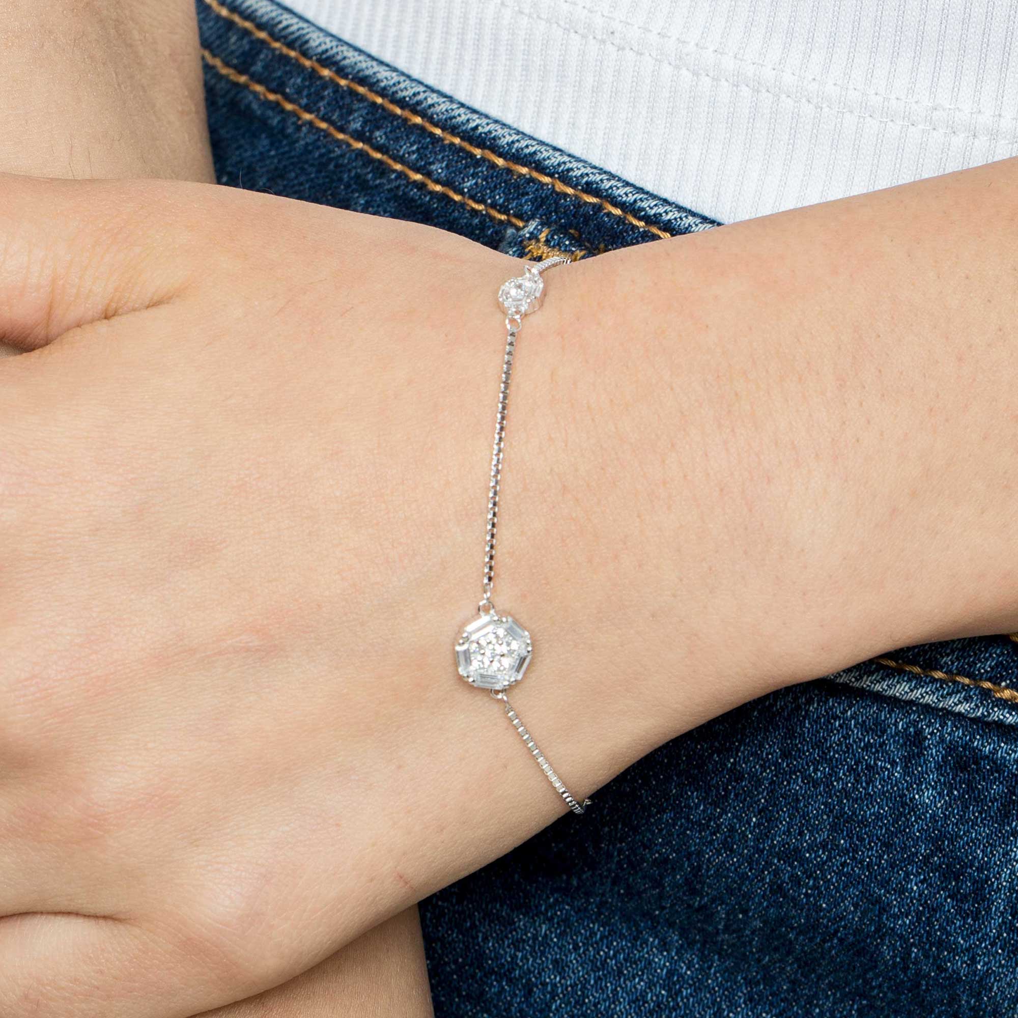 The Pentastel Pentagon Solitaire Bracelet is a striking, geometric piece crafted from sleek 925 sterling silver. It features a central pentagon-shaped charm that showcases a single, prominent solitaire diamond (or high-quality cubic zirconia) for maximum brilliance. This modern bracelet offers a clean, architectural design with a dazzling focal point, perfect for contemporary elegance.