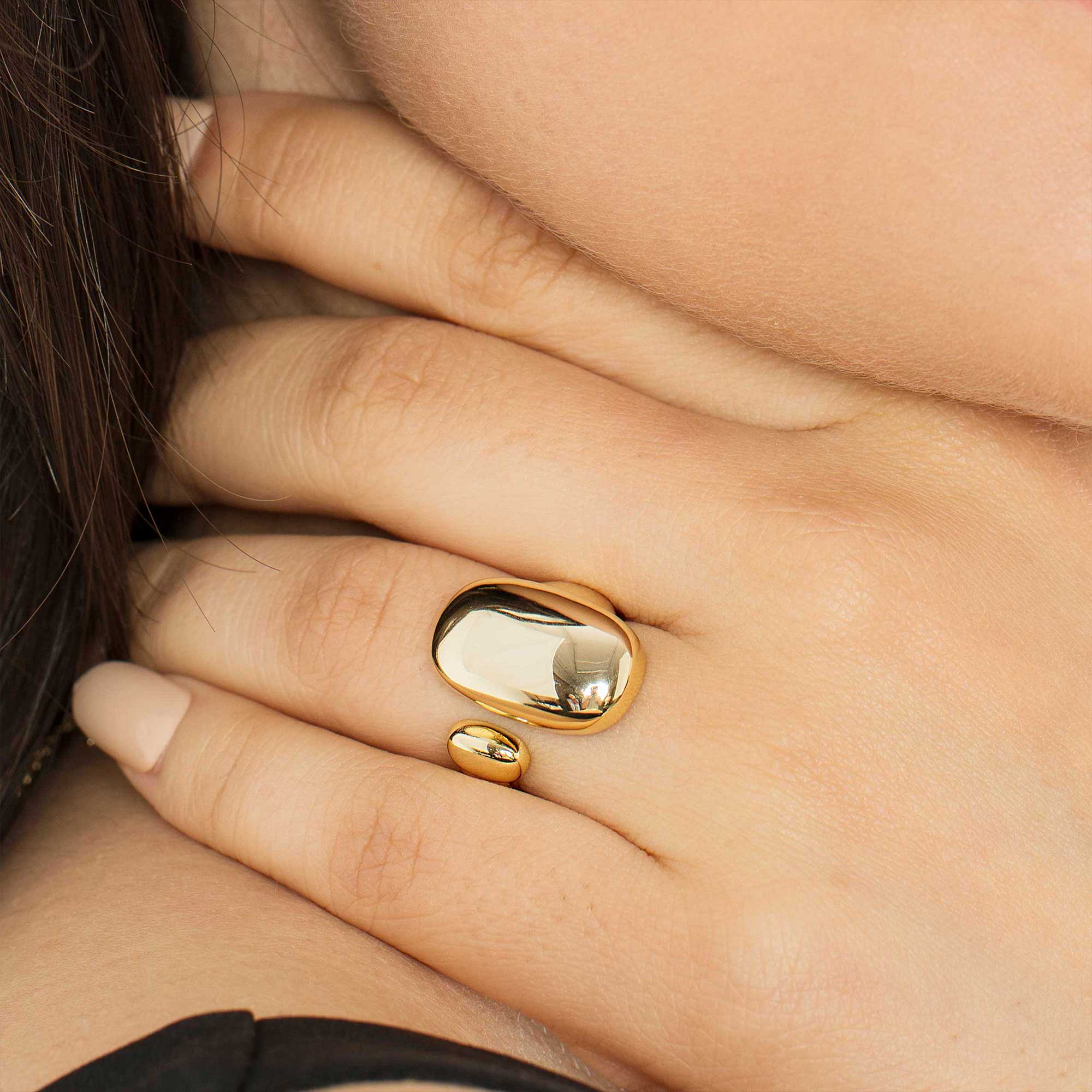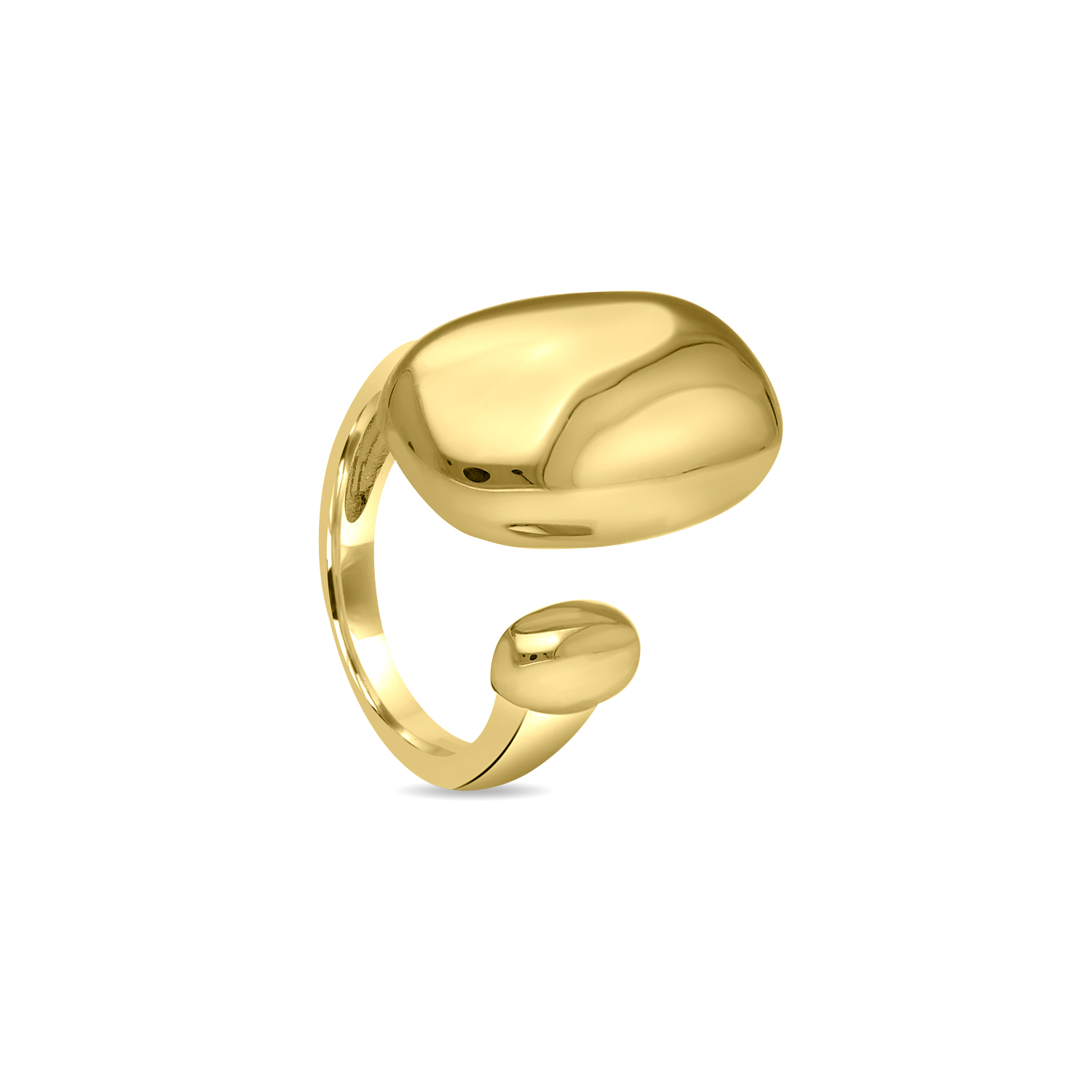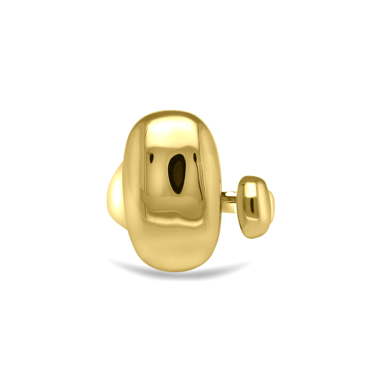 This Solara ring features a prominent, highly polished, oval-shaped dome design with a luxurious gold-tone finish. The ring has an adjustable open band, which allows for a flexible and comfortable fit. Its bold, smooth, and minimalist profile creates a contemporary statement piece. The dome on the top half of the band gives it a substantial yet sleek appearance.