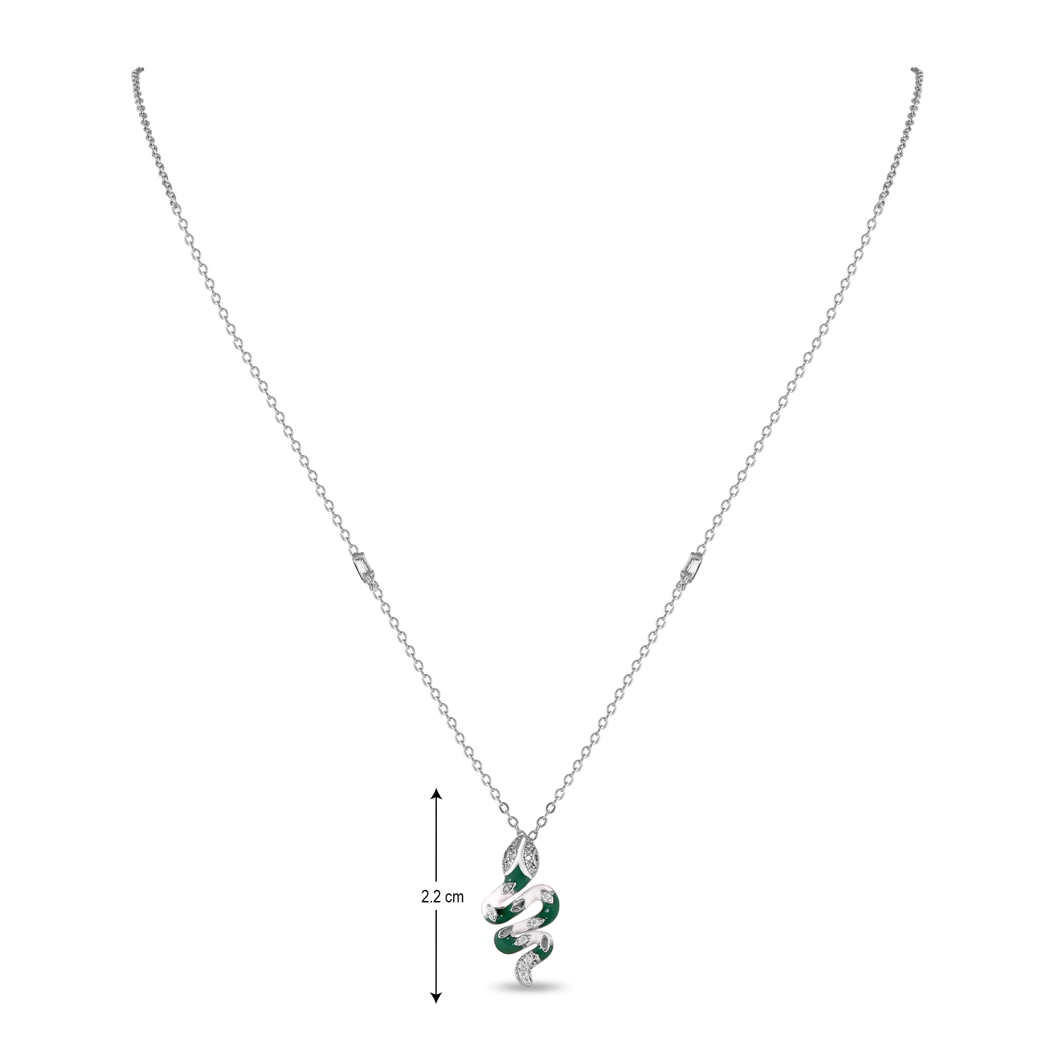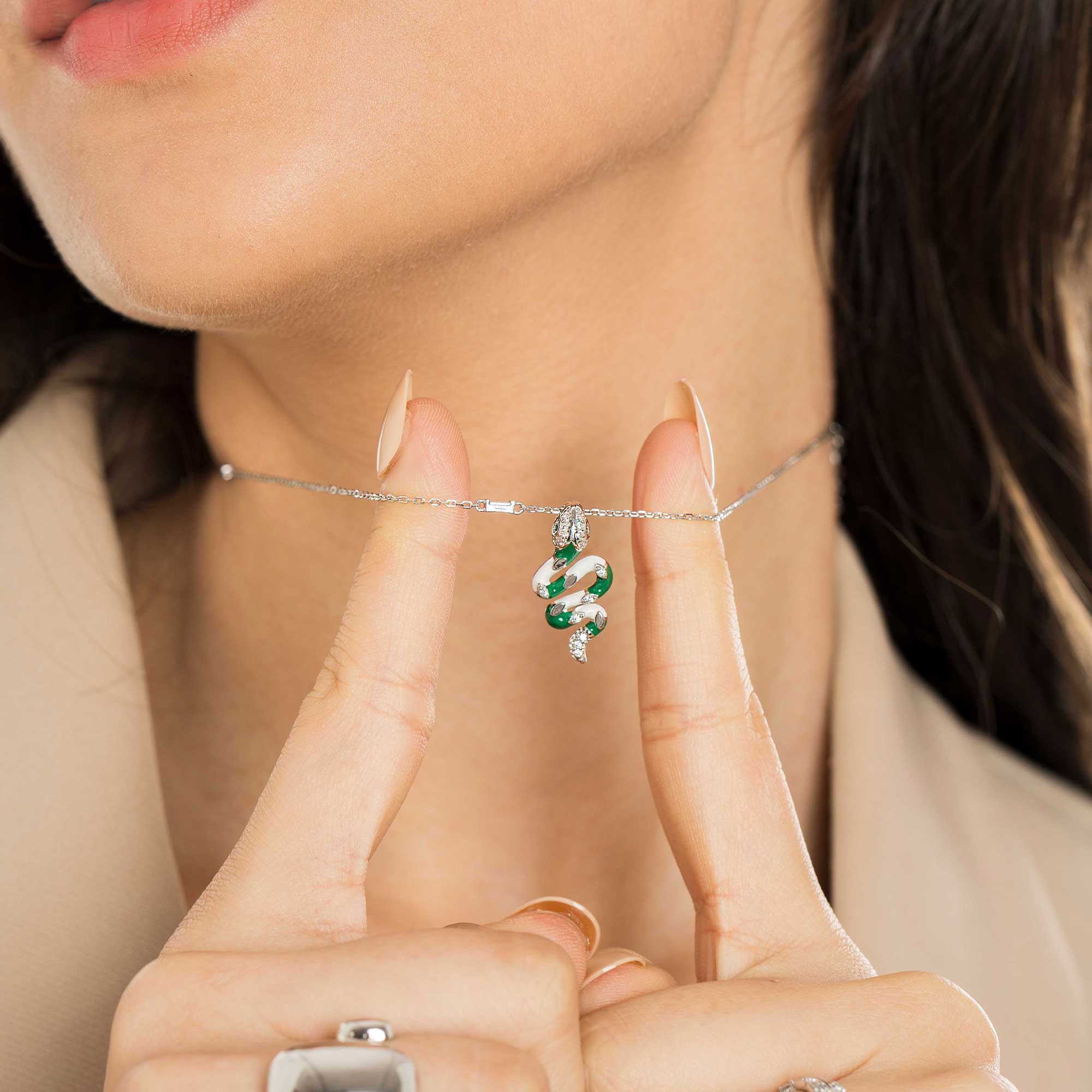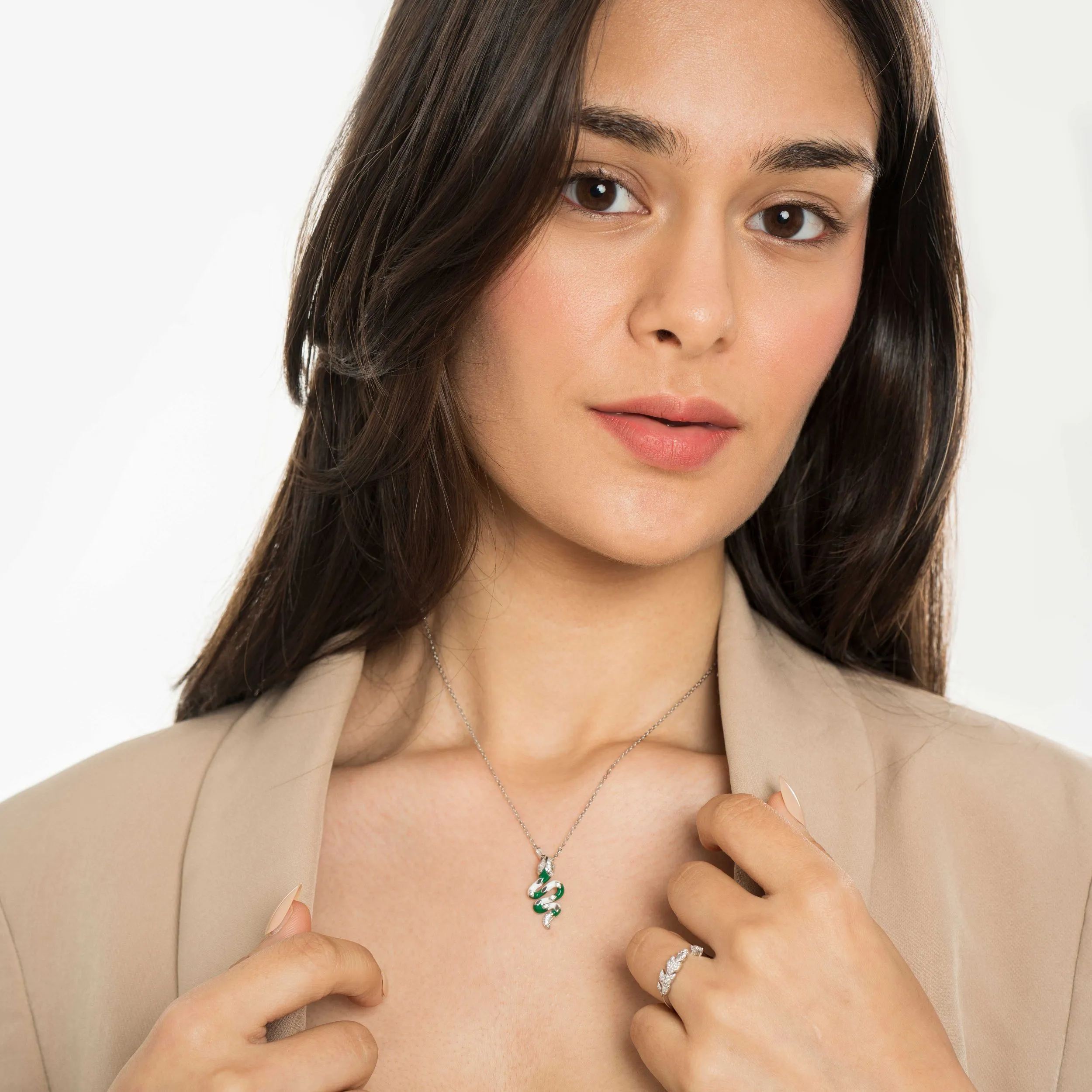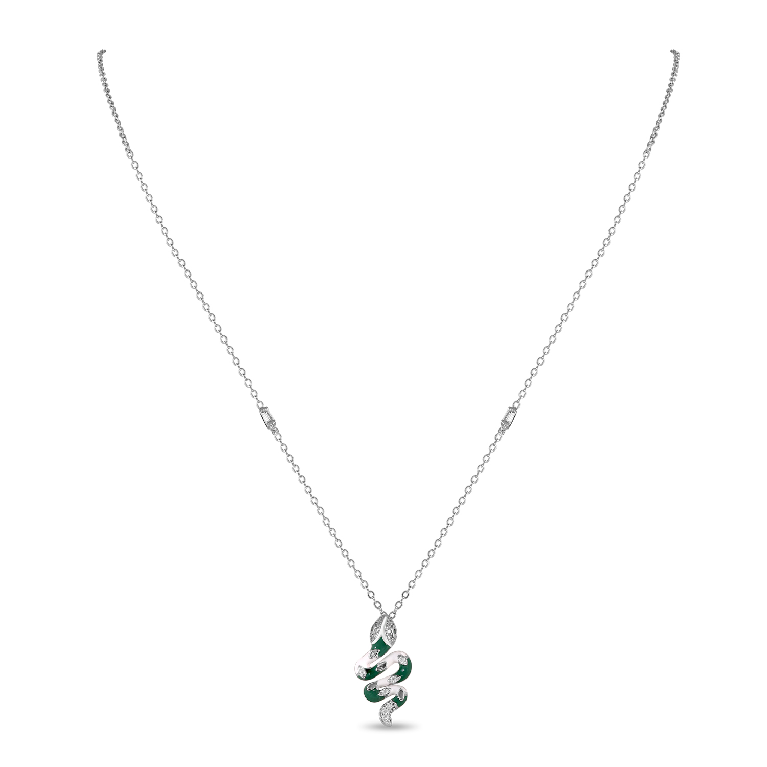 Venira — a symbol of strength, transformation, and allure. Crafted in 92.5 sterling silver, this necklace features a serpent motif gracefully wrapped around itself, detailed with white and emerald enamel for a bold, sophisticated finish.
